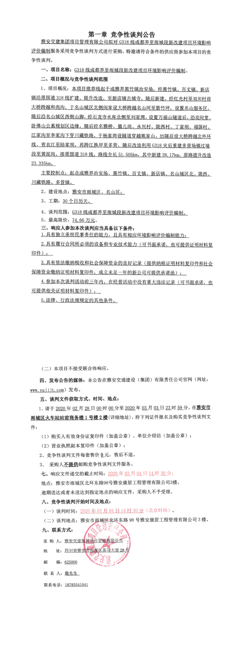 雅安交建集團(tuán)項(xiàng)目管理有限公司G318線成都界至雨城段新改建項(xiàng)目環(huán)境影響評價(jià)編制競爭性談判公告