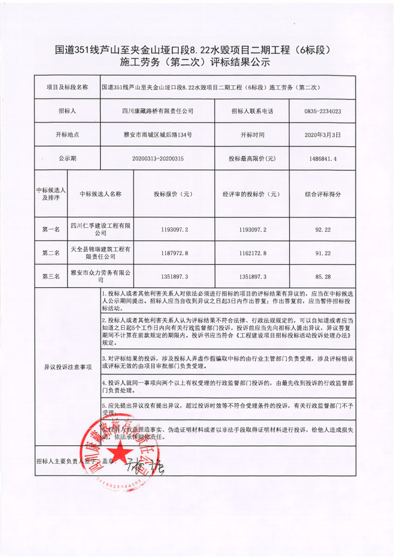 四川康藏路橋有限責(zé)任公司國(guó)道351線蘆山至夾金山埡口段8.22水毀項(xiàng)目二期工程(1標(biāo)段)施工勞務(wù)(第二次)評(píng)標(biāo)結(jié)果公示