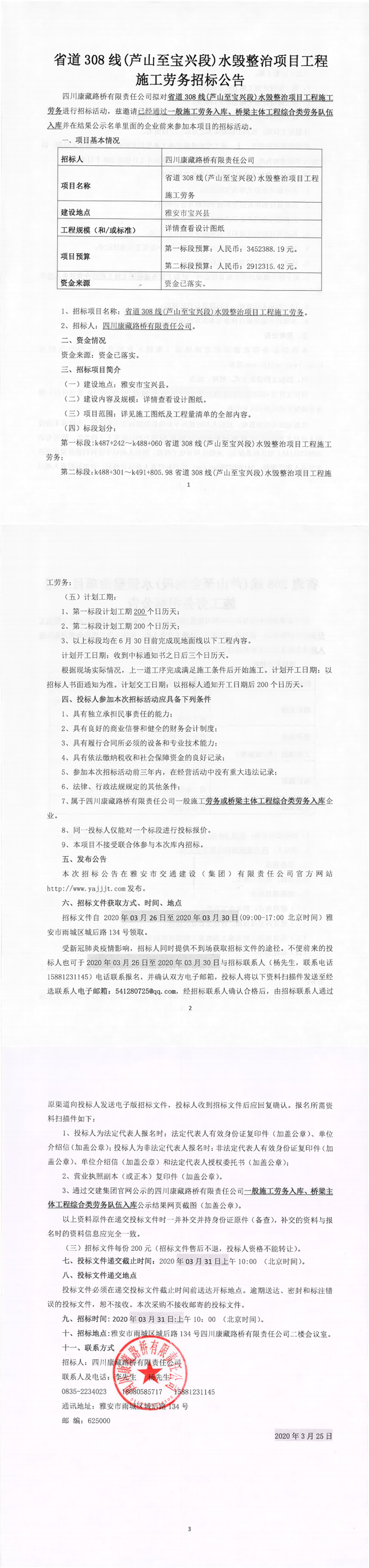 四川康藏路橋有限責(zé)任公司省道308線(蘆山至寶興段)水毀整治項(xiàng)目工程施工勞務(wù)招標(biāo)公告