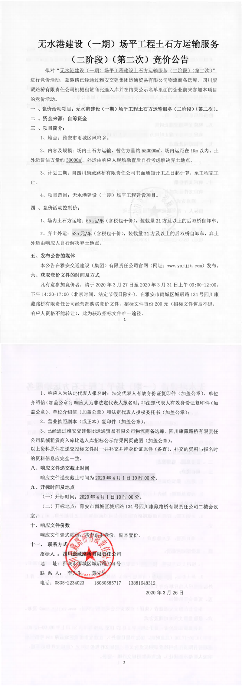 四川康藏路橋有限責(zé)任公司無水港建設(shè)(一期)場平工程建設(shè)土石方運(yùn)輸服務(wù)(二階段)(第二次)競價(jià)公告