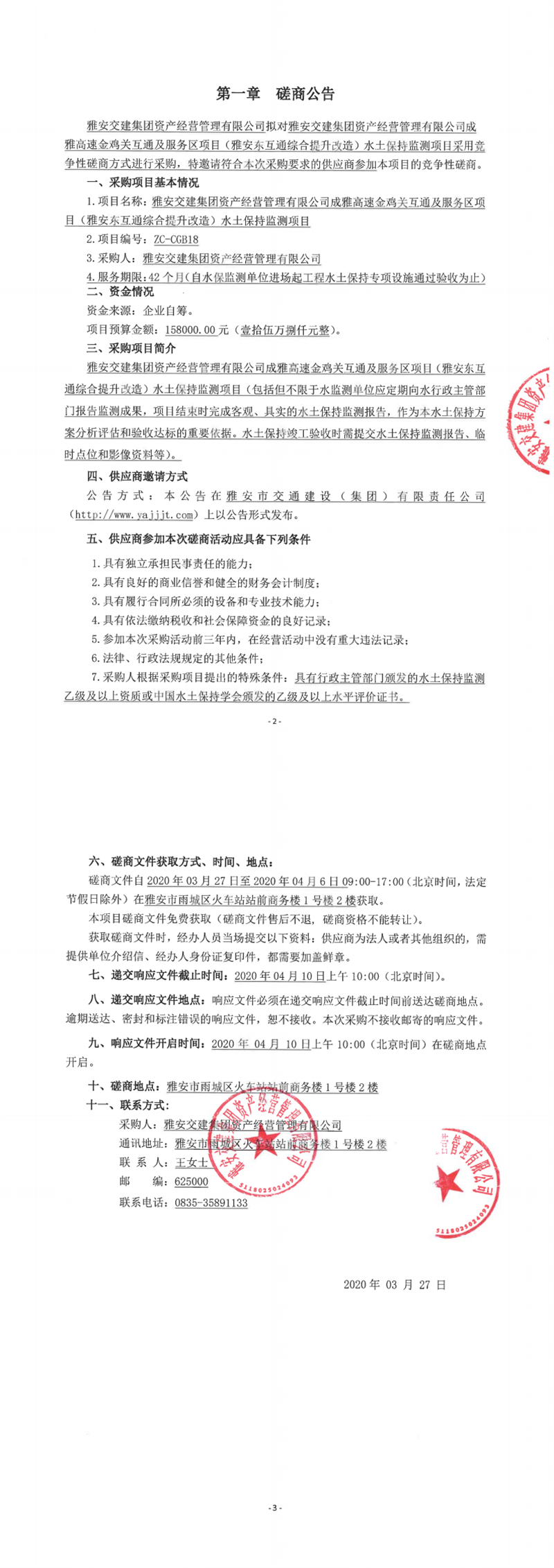 雅安交建集團(tuán)資產(chǎn)經(jīng)營(yíng)管理有限公司成雅高速金雞關(guān)互通及服務(wù)區(qū)項(xiàng)目(雅安東互通綜合提升改造)水土保持監(jiān)測(cè)項(xiàng)目競(jìng)爭(zhēng)性磋商公告