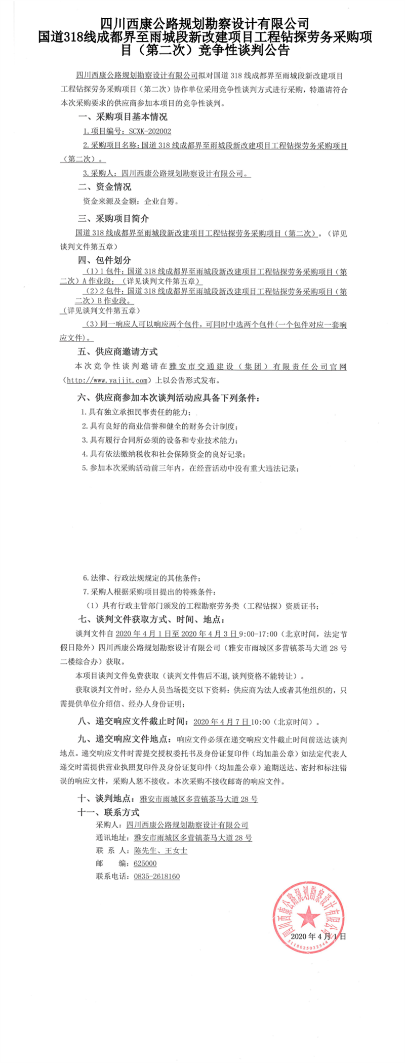 四川西康公路規(guī)劃勘察設(shè)計(jì)有限公司國道318線成都界至雨城段新改建項(xiàng)目工程鉆探勞務(wù)采購項(xiàng)目(第二次)競(jìng)爭(zhēng)性談判公告