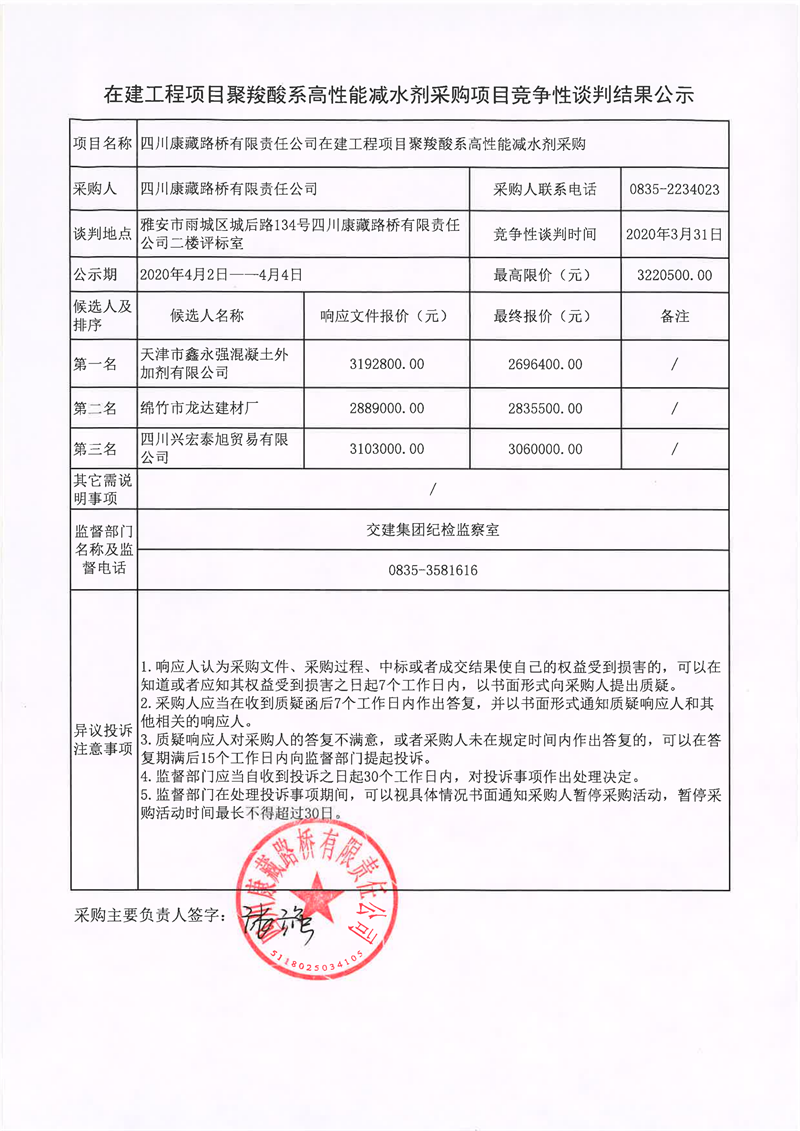 四川康藏路橋有限責(zé)任公司在建工程項(xiàng)目聚羧酸系高性能減水劑采購項(xiàng)目競爭性談判結(jié)果公示