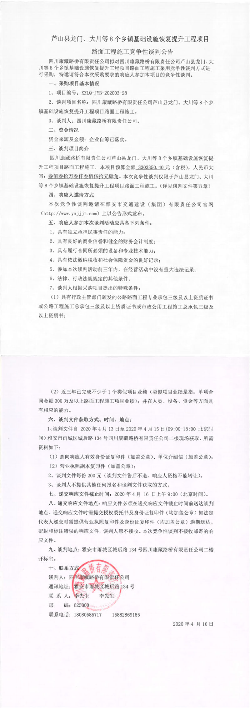 四川康藏路橋有限責(zé)任公司蘆山縣龍門、大川等8個(gè)鄉(xiāng)鎮(zhèn)基礎(chǔ)設(shè)施恢復(fù)提升工程項(xiàng)目路面工程施工競爭性談判公告