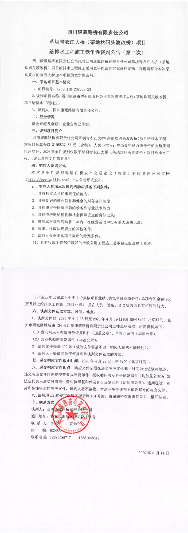 四川康藏路橋有限責(zé)任公司草壩青衣江大橋(茶地坎碼頭渡改橋)項(xiàng)目給排水工程施工競爭性談判公告(第二次)