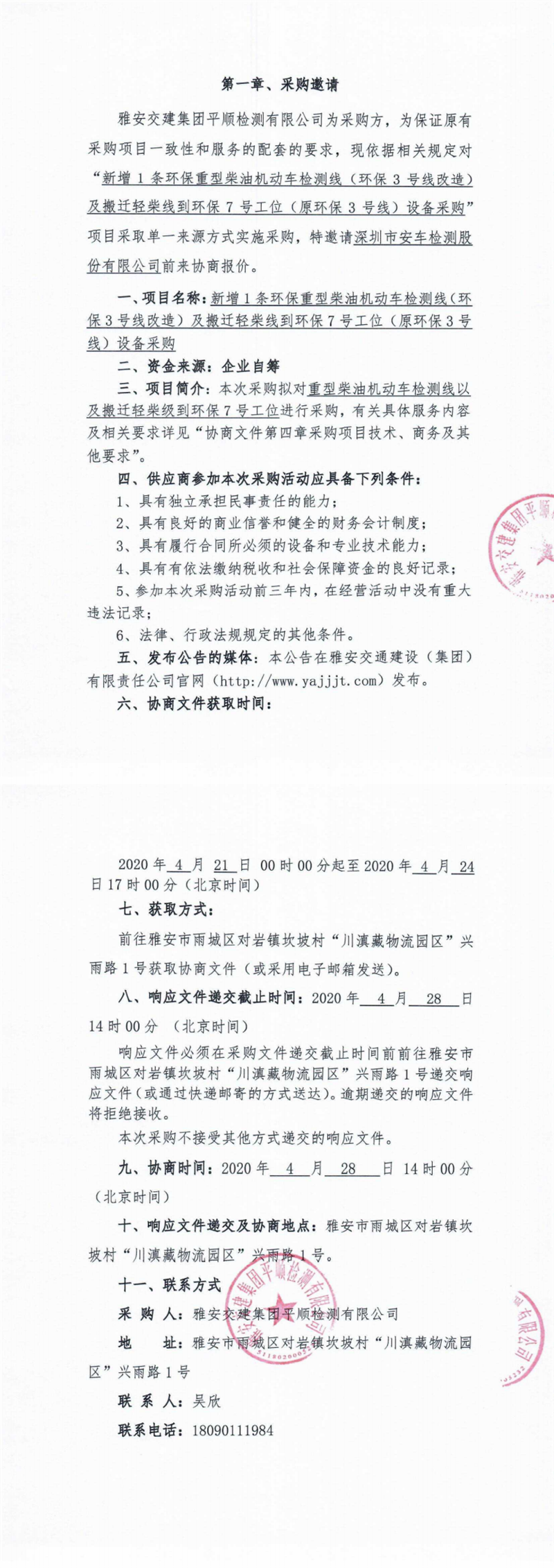 雅安交建集團平順檢測有限公司新增1條環(huán)保重型柴油機動車檢測線(環(huán)保3號線改造)及搬遷輕柴線到環(huán)保7號工位(原環(huán)保3號線)設備采購單一來源協(xié)商公告
