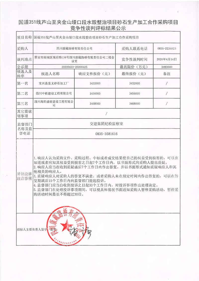 四川康藏路橋有限責(zé)任公司國道351線蘆山至夾金山埡口段水毀整治項(xiàng)目砂石生產(chǎn)加工合作采購項(xiàng)目競爭性談判評(píng)標(biāo)結(jié)果公示