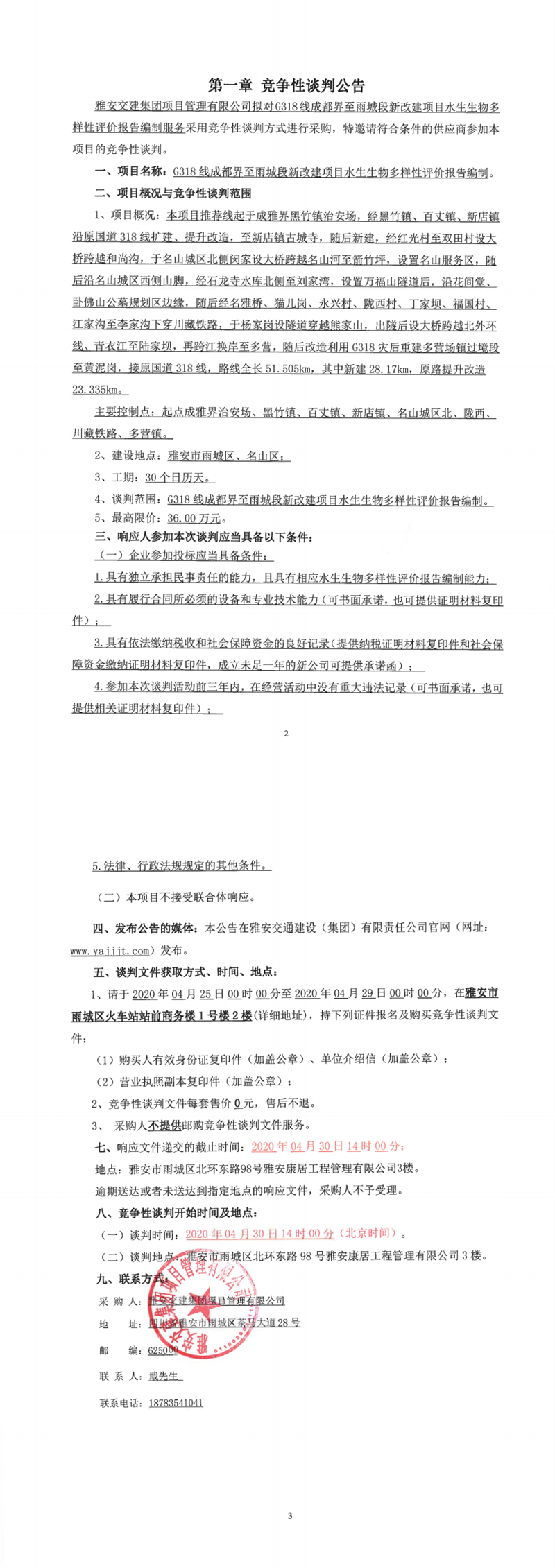 雅安交建集團(tuán)項(xiàng)目管理有限公司G318線(xiàn)成都界至雨城段新改建項(xiàng)目水生生物多樣性影響評(píng)價(jià)編制競(jìng)爭(zhēng)性談判公告