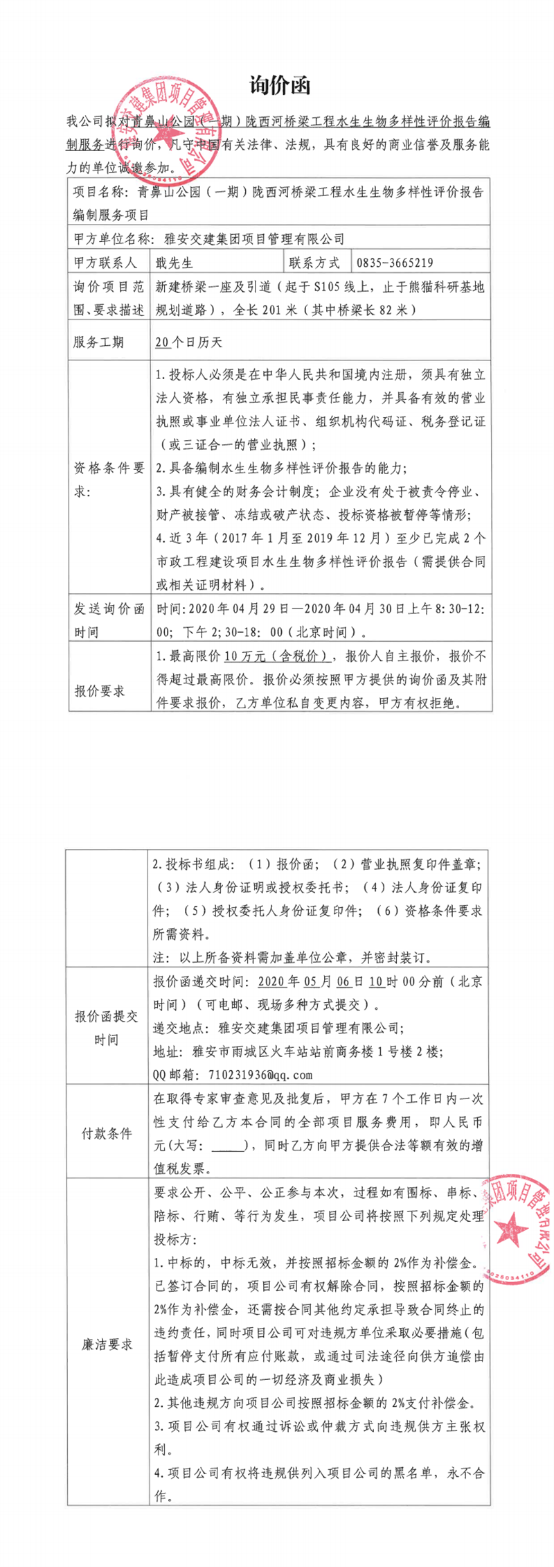 雅安交建集團(tuán)項(xiàng)目管理有限公司青鼻山公園(一期)隴西河橋梁工程水生生物多樣性評(píng)價(jià)報(bào)告編制服務(wù)項(xiàng)目詢(xún)價(jià)函