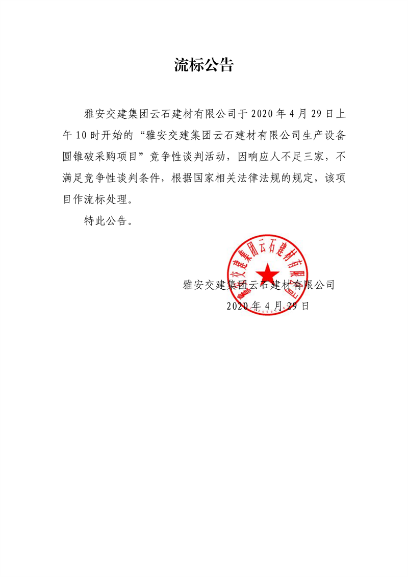 雅安交建集團云石建材有限公司生產設備圓錐破采購項目流標公告