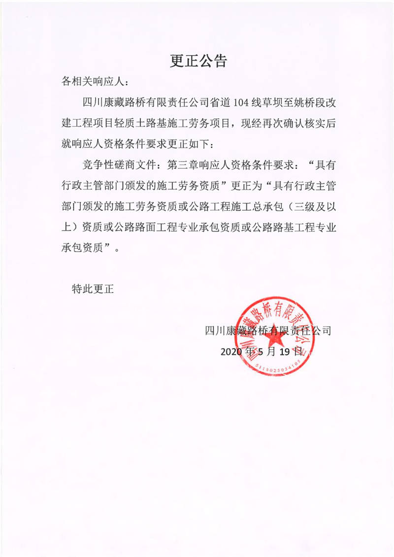 四川康藏路橋有限責任公司省道104線草壩至姚橋段改建工程項目輕質土路基施工勞務項目更正公告