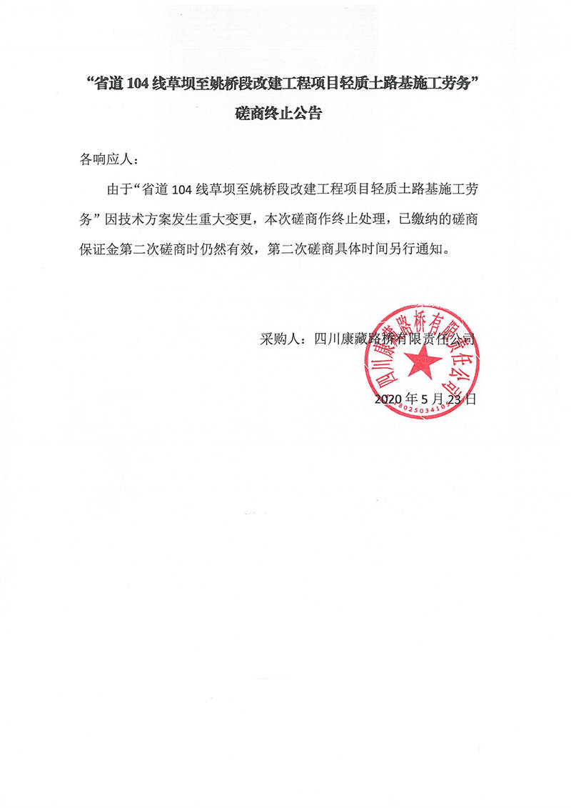 四川康藏路橋有限責(zé)任公司省道104線草壩至姚橋段改建工程項目輕質(zhì)土路基施工勞務(wù)磋商終止公告