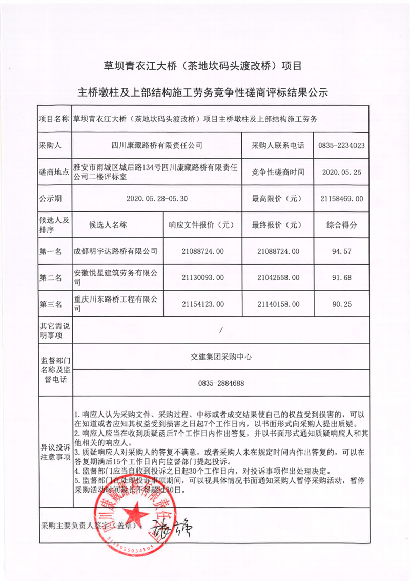 四川康藏路橋有限責(zé)任公司草壩青衣江大橋(茶地坎碼頭渡改橋)項(xiàng)目主橋墩柱及上部結(jié)構(gòu)施工勞務(wù)競爭性磋商評(píng)標(biāo)結(jié)果公示
