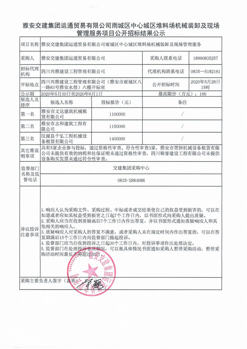 雅安交建集團運通貿(mào)易有限公司雨城區(qū)中心城區(qū)堆料場機械裝卸及現(xiàn)場管理服務(wù)項目公開招標結(jié)果公示