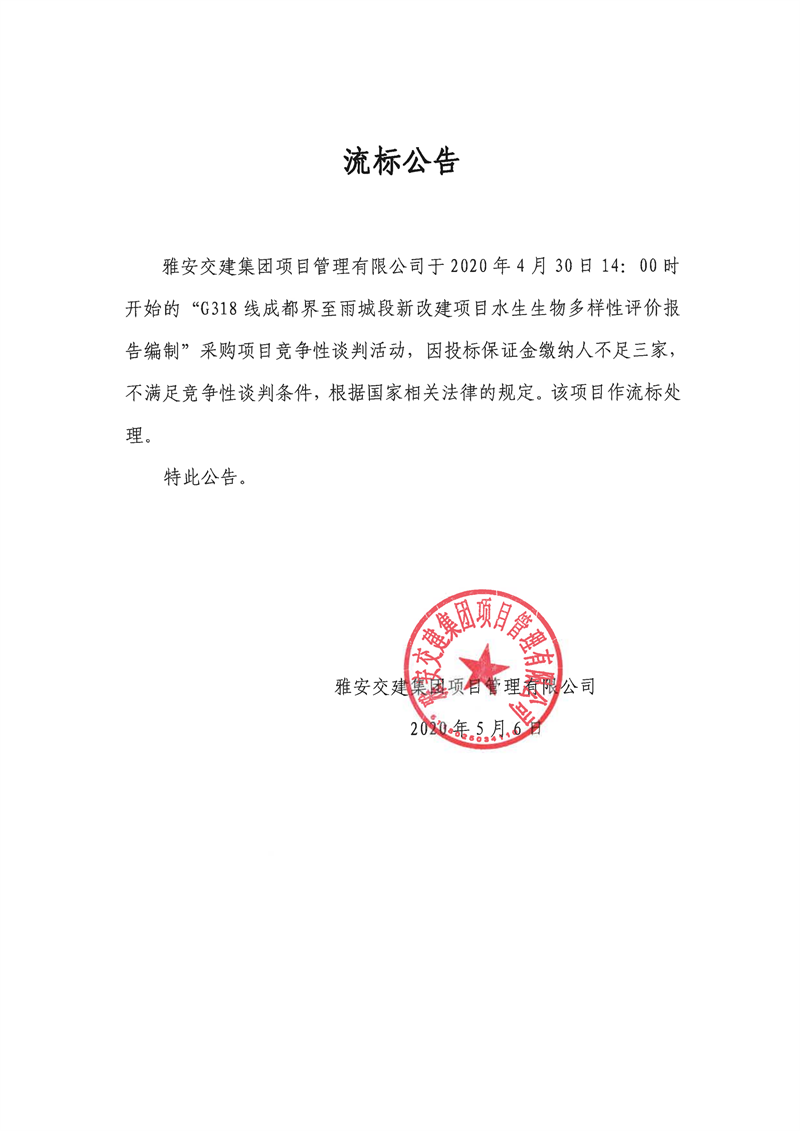 雅安交建集團項目管理有限公司G318線成都界至雨城段新改建項目水生生物多樣性評價報告編制流標公告