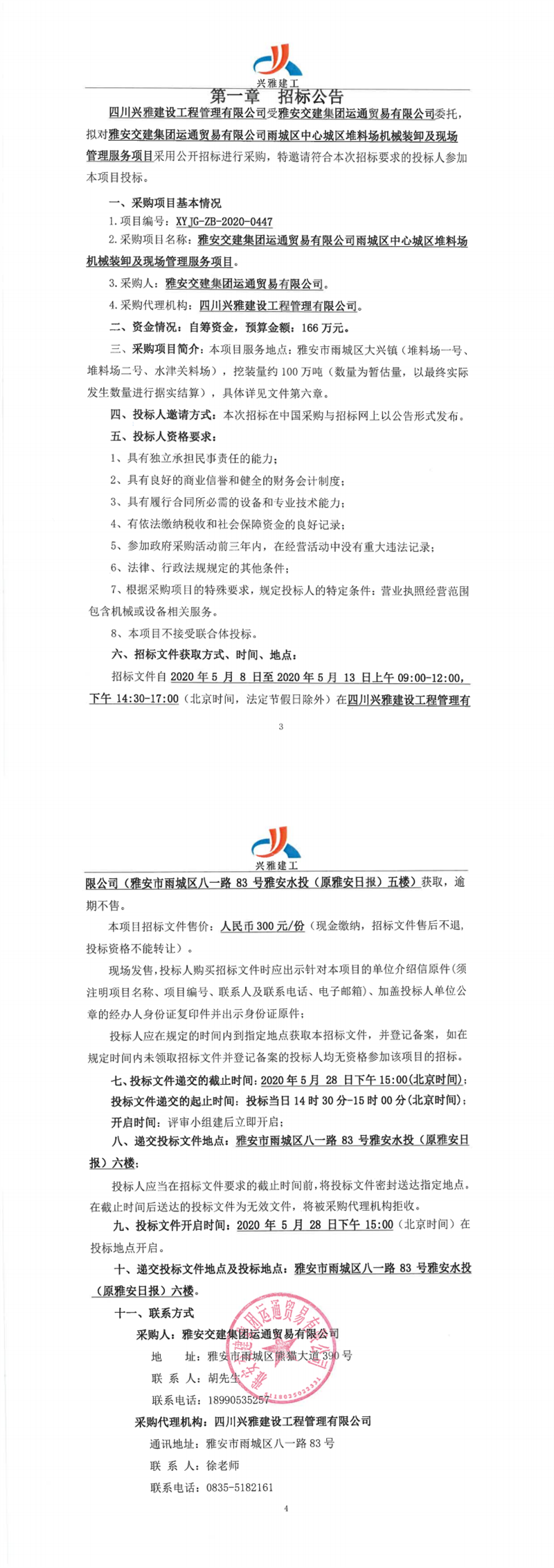 雅安交建集團(tuán)運(yùn)通貿(mào)易有限公司雨城區(qū)中心城區(qū)堆料場(chǎng)機(jī)械裝卸及現(xiàn)場(chǎng)管理服務(wù)項(xiàng)目招標(biāo)公告