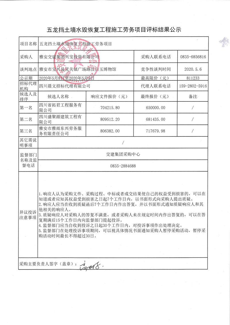 雅安交建集團興寶投資有限公司五龍擋土墻水毀恢復(fù)工程施工勞務(wù)項目評標結(jié)果公示