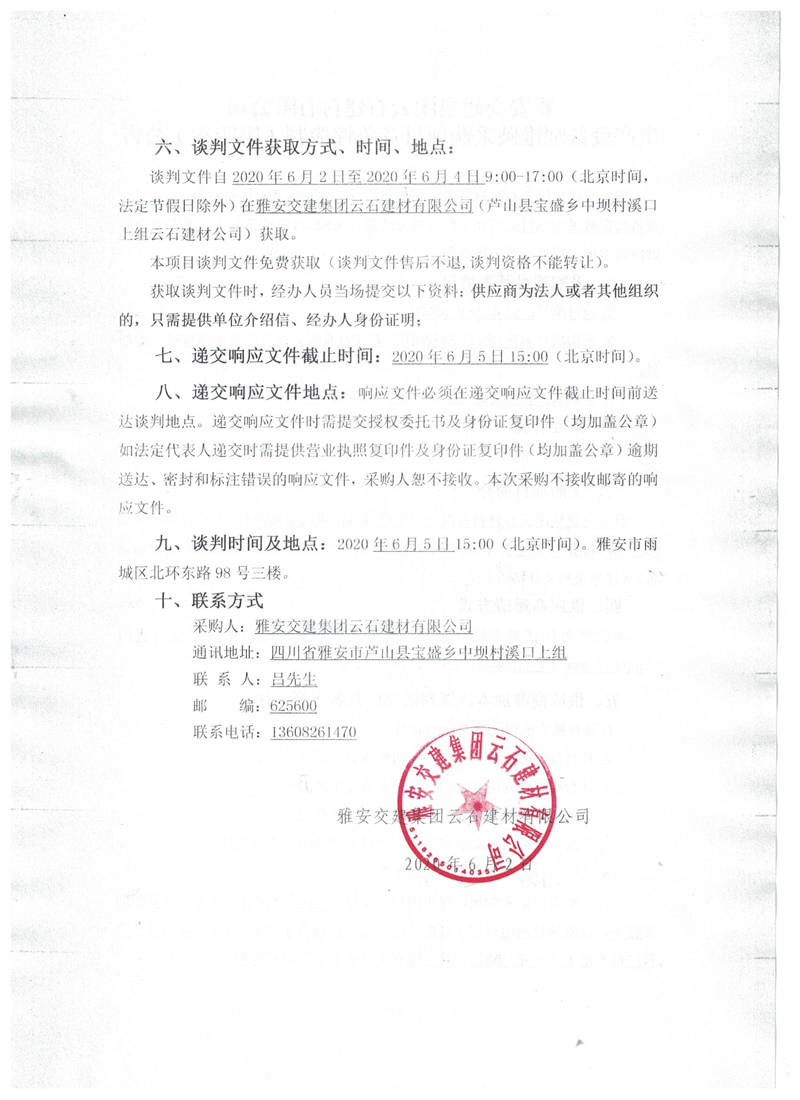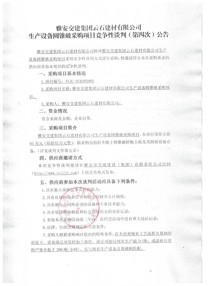 雅安交建集團(tuán)云石建材有限公司生產(chǎn)設(shè)備圓錐破采購項目競爭性談判(第四次)公告