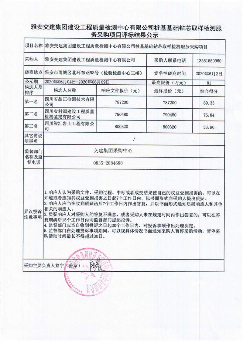 雅安交建集團建設(shè)工程質(zhì)量檢測中心有限公司樁基基礎(chǔ)鉆芯取樣檢測服務(wù)采購項目評標(biāo)結(jié)果公示