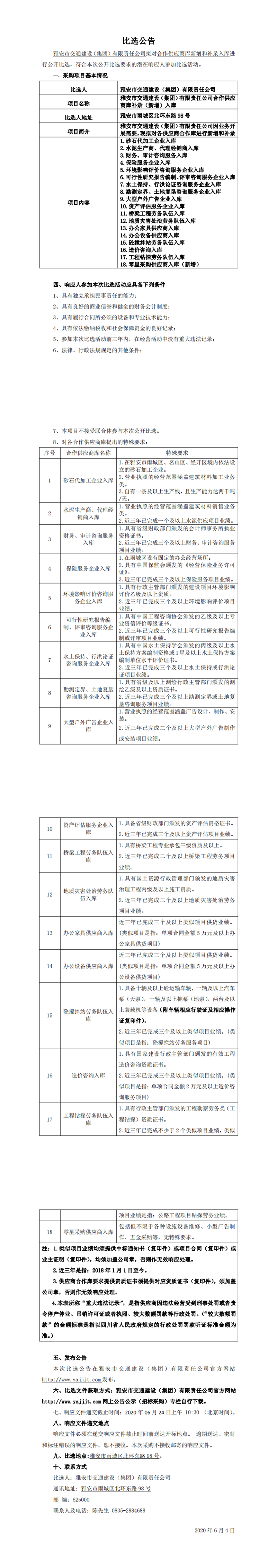 雅安市交通建設(shè)(集團(tuán))有限責(zé)任公司合作供應(yīng)商庫補錄(新增)入庫比選公告