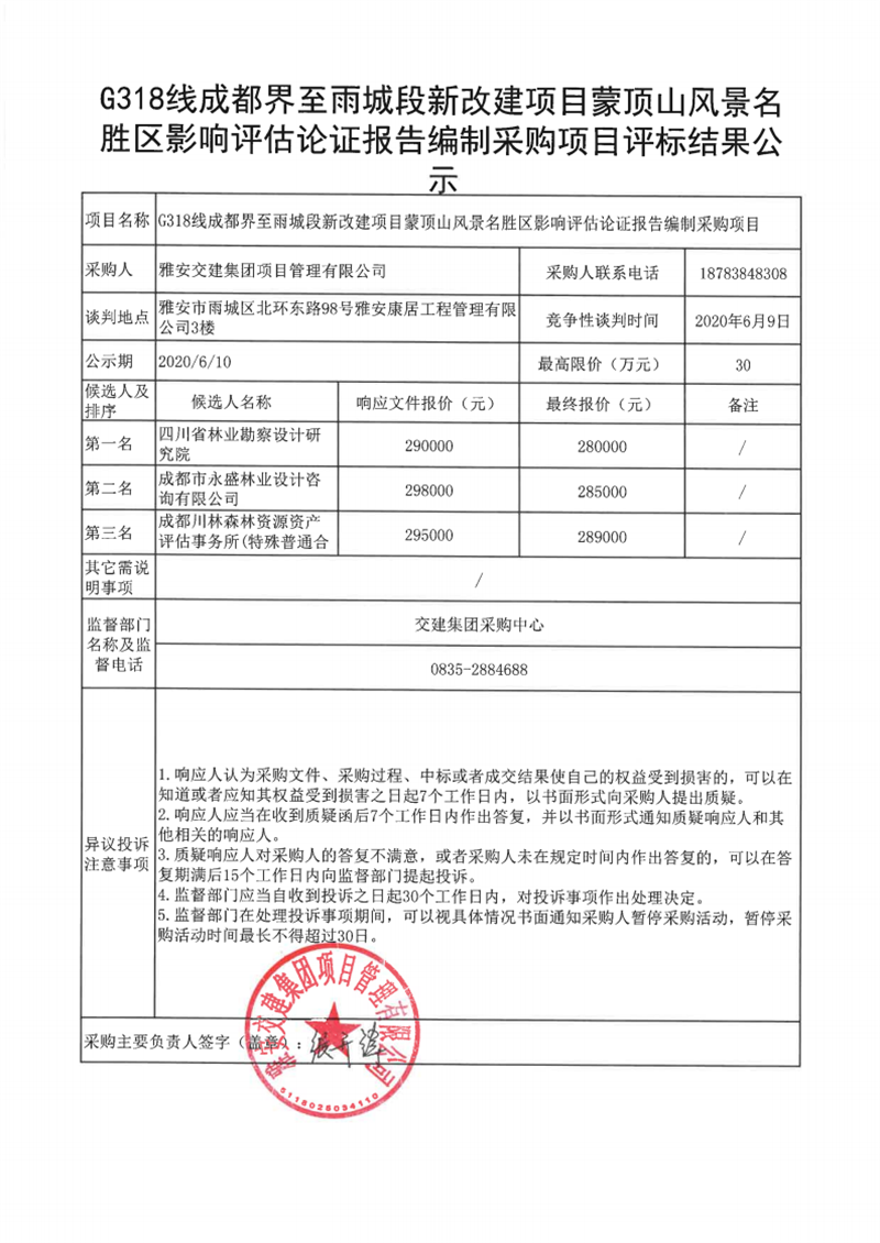 雅安交建集團(tuán)項目管理有限公司G318線成都界至雨城段新改建項目蒙頂山風(fēng)景名勝區(qū)影響評估論證報告編制采購項目評標(biāo)結(jié)果公示