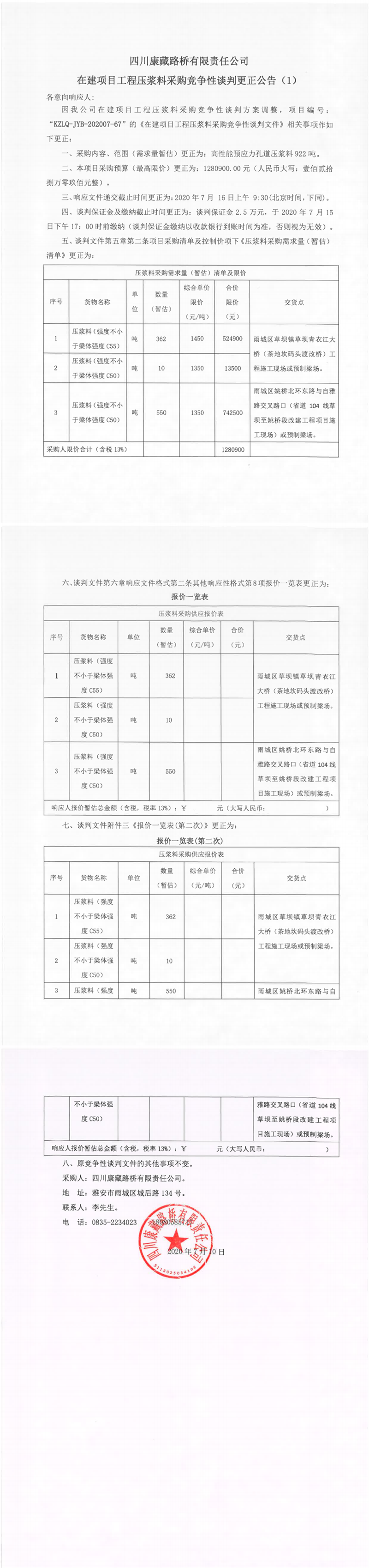 四川康藏路橋有限責(zé)任公司在建項目工程壓漿料采購競爭性談判更正公告(1)