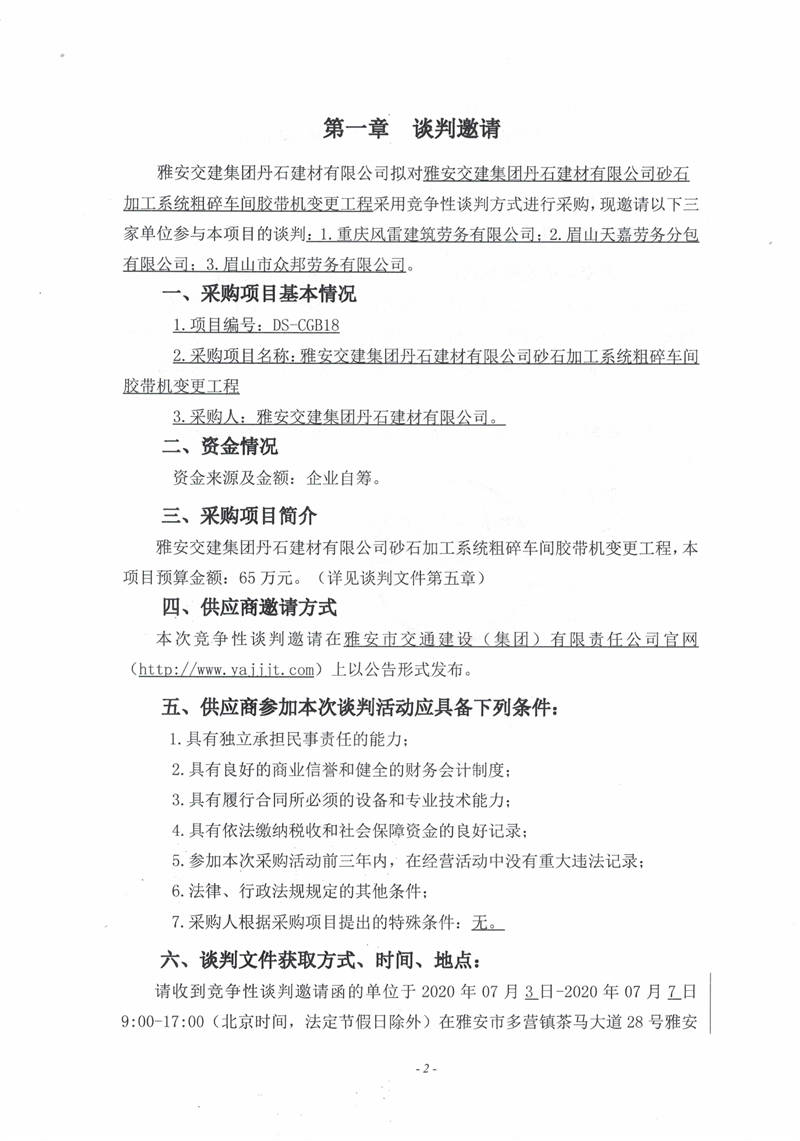 雅安交建集團(tuán)丹石建材有限公司砂石加工系統(tǒng)粗碎車間膠帶機(jī)變更工程競爭性談判邀請公告