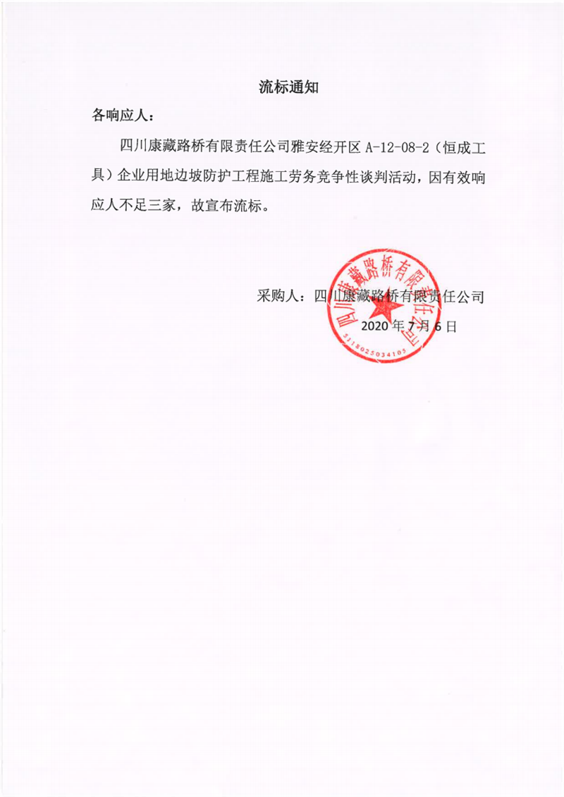 四川康藏路橋有限責任公司雅安經(jīng)開區(qū)A-12-08-2(恒成工具)企業(yè)用地邊坡防護工程施工勞務(wù)流標通知