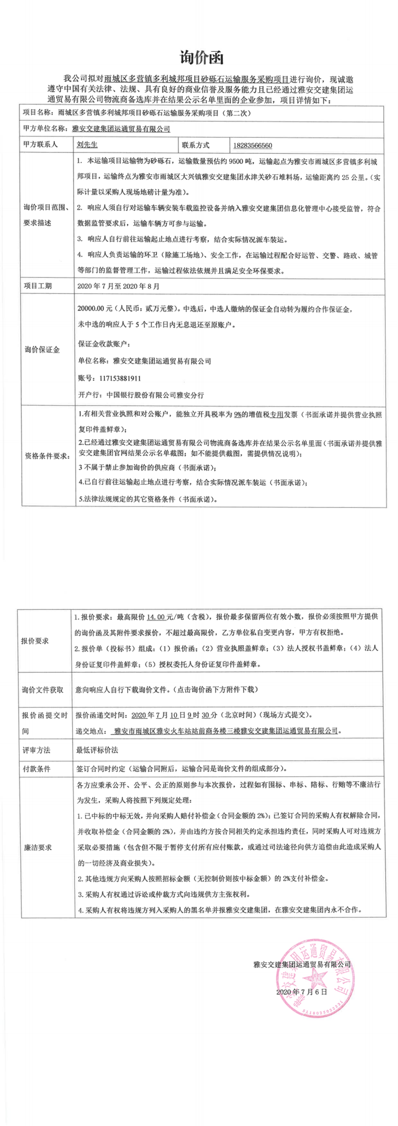 雅安交建集團(tuán)運(yùn)通貿(mào)易有限公司雨城區(qū)多營鎮(zhèn)多利城邦項(xiàng)目砂礫石運(yùn)輸服務(wù)采購項(xiàng)目(第二次)詢價(jià)函