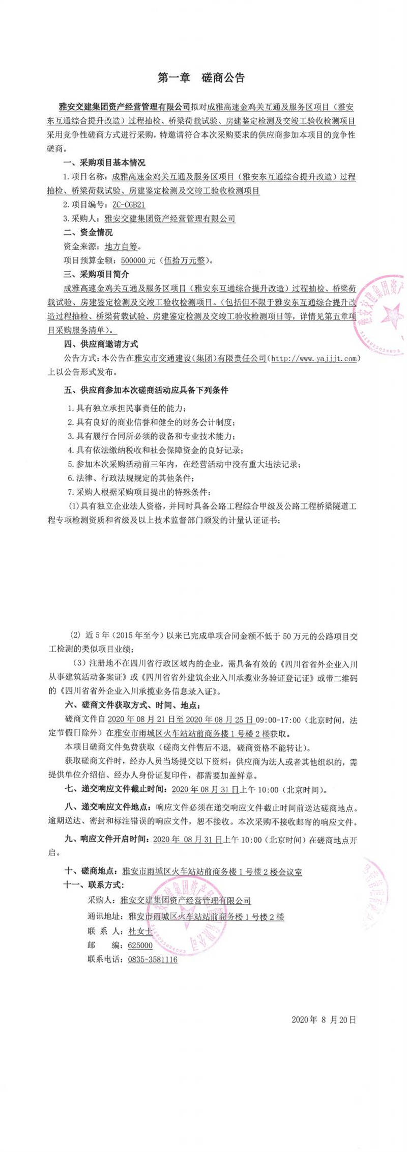 雅安交建集團資產(chǎn)經(jīng)營管理有限公司成雅高速金雞關(guān)互通及服務區(qū)項目(雅安東互通綜合提升改造)過程抽檢、橋梁荷載試驗、房建鑒定檢測及交竣工驗收檢測項目磋商公告