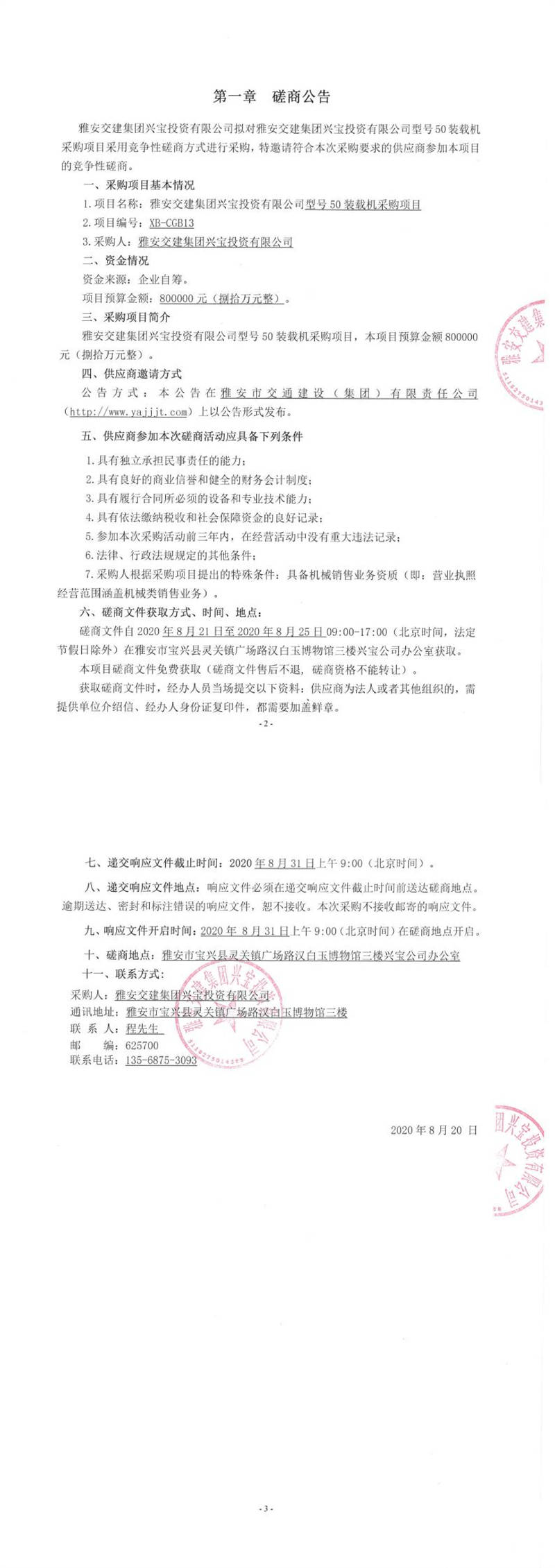 雅安交建集團(tuán)興寶投資有限公司型號50裝載機(jī)采購項(xiàng)目磋商公告