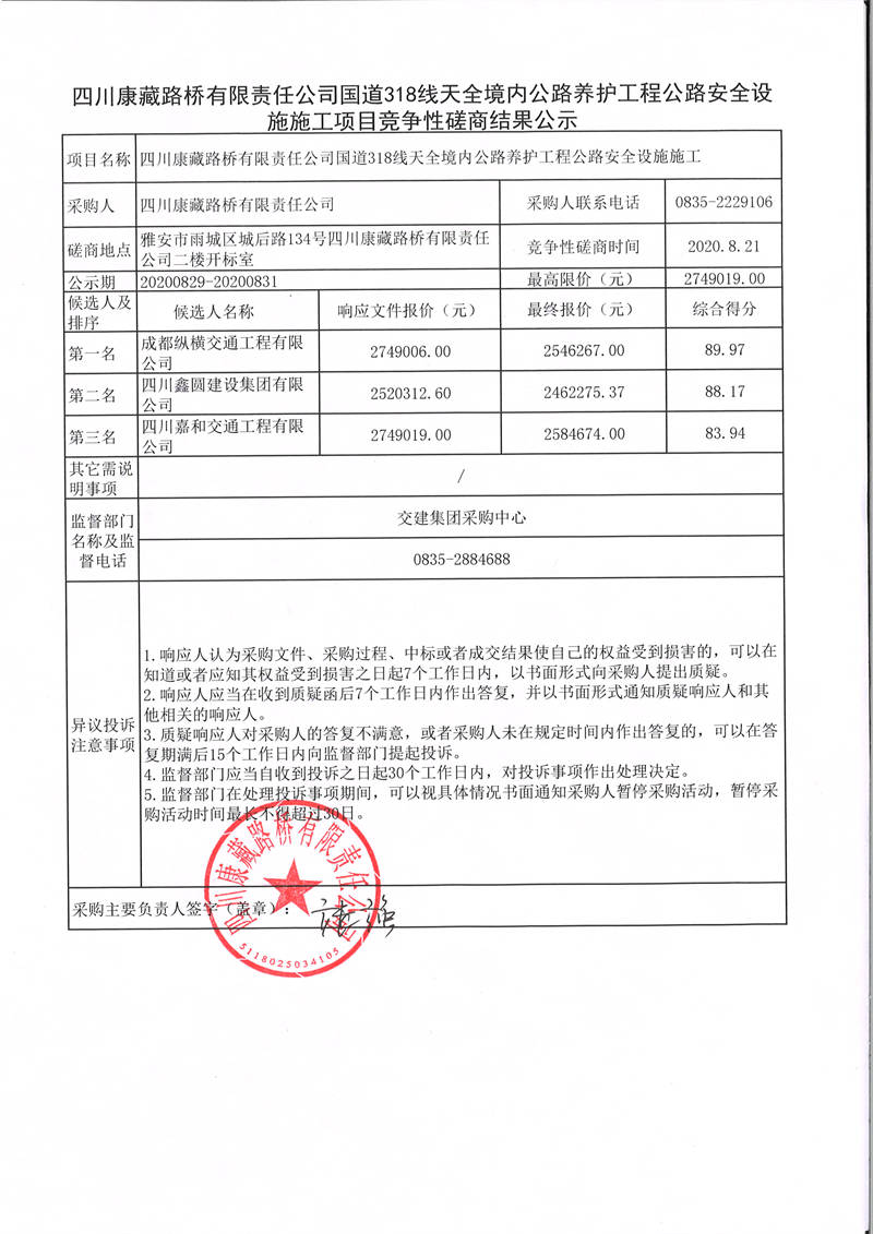 四川康藏路橋有限責任公司國道318線天全境內(nèi)公路養(yǎng)護工程公路安全設施施工項目競爭性磋商結(jié)果公示