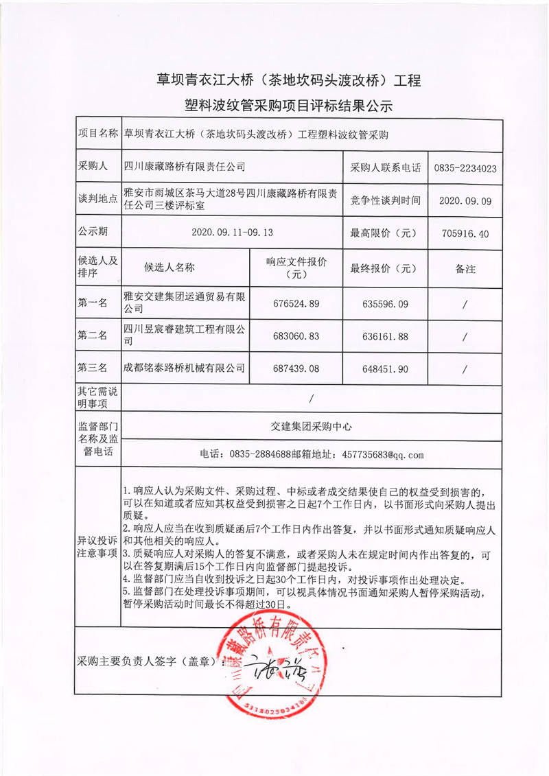 四川康藏路橋有限責(zé)任公司草壩青衣江大橋(茶地坎碼頭渡改橋)工程塑料波紋管采購(gòu)項(xiàng)目評(píng)標(biāo)結(jié)果公示
