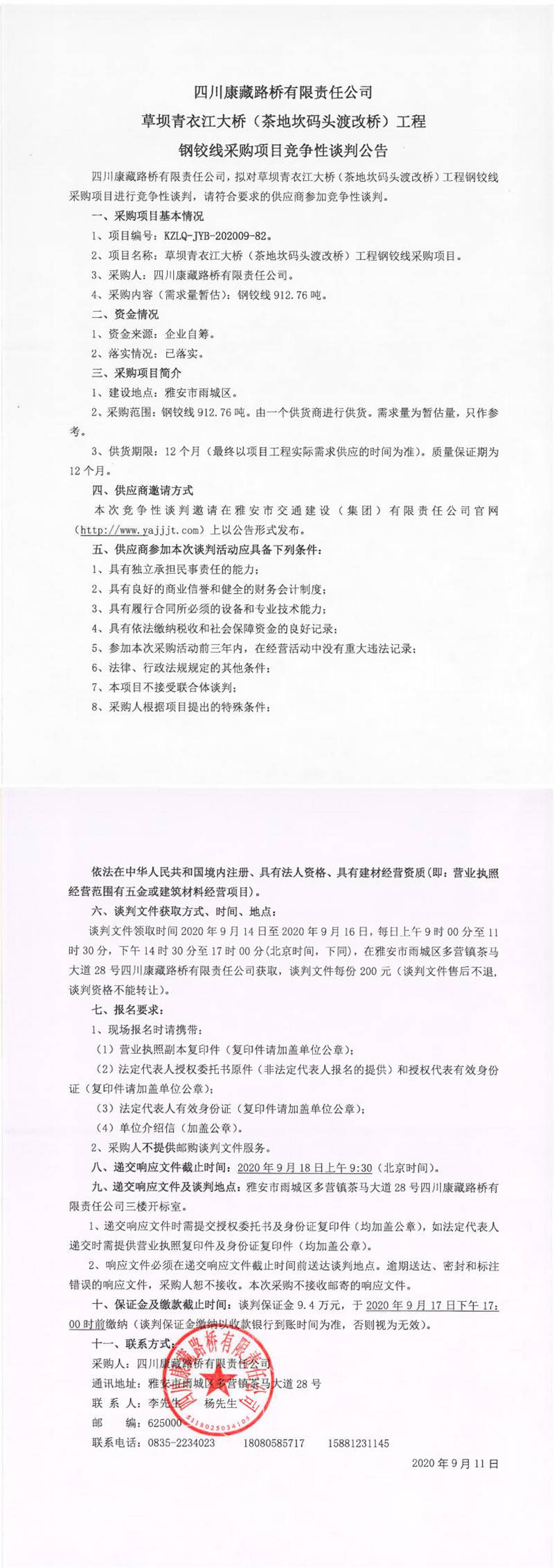 四川康藏路橋有限責(zé)任公司草壩青衣江大橋(茶地坎碼頭渡改橋)工程鋼鉸線采購項(xiàng)目競(jìng)爭性談判公告
