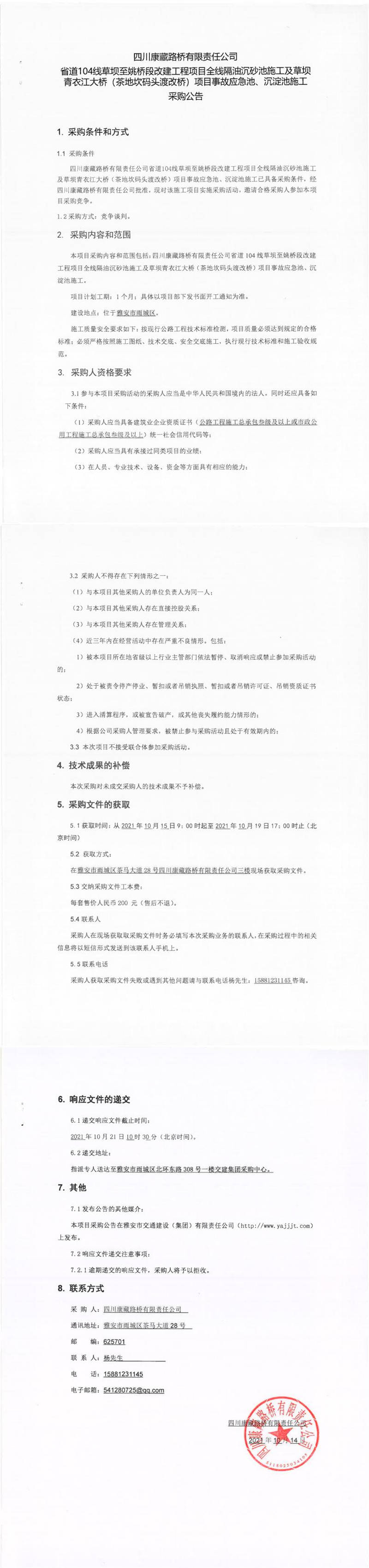 四川康藏路橋有限責(zé)任公司省道104線(xiàn)草壩至姚橋段改建項(xiàng)目全線(xiàn)隔油沉砂池施工及草壩青衣江大橋(茶地坎碼頭渡改橋)項(xiàng)目事故應(yīng)急池、沉淀池施工采購(gòu)公告