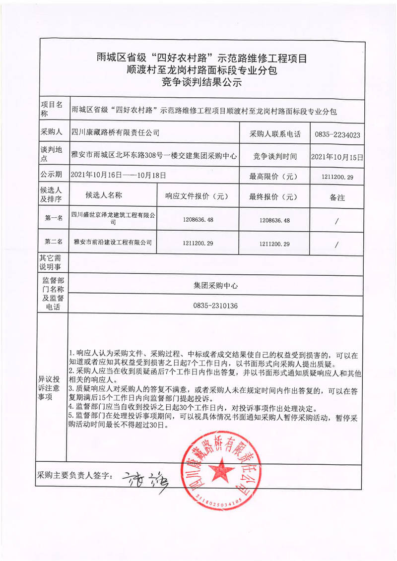四川康藏路橋有限責(zé)任公司雨城區(qū)省級“四好農(nóng)村路”示范路維修工程項(xiàng)目順渡村至龍崗村路面標(biāo)段專業(yè)分包競爭談判結(jié)果公示