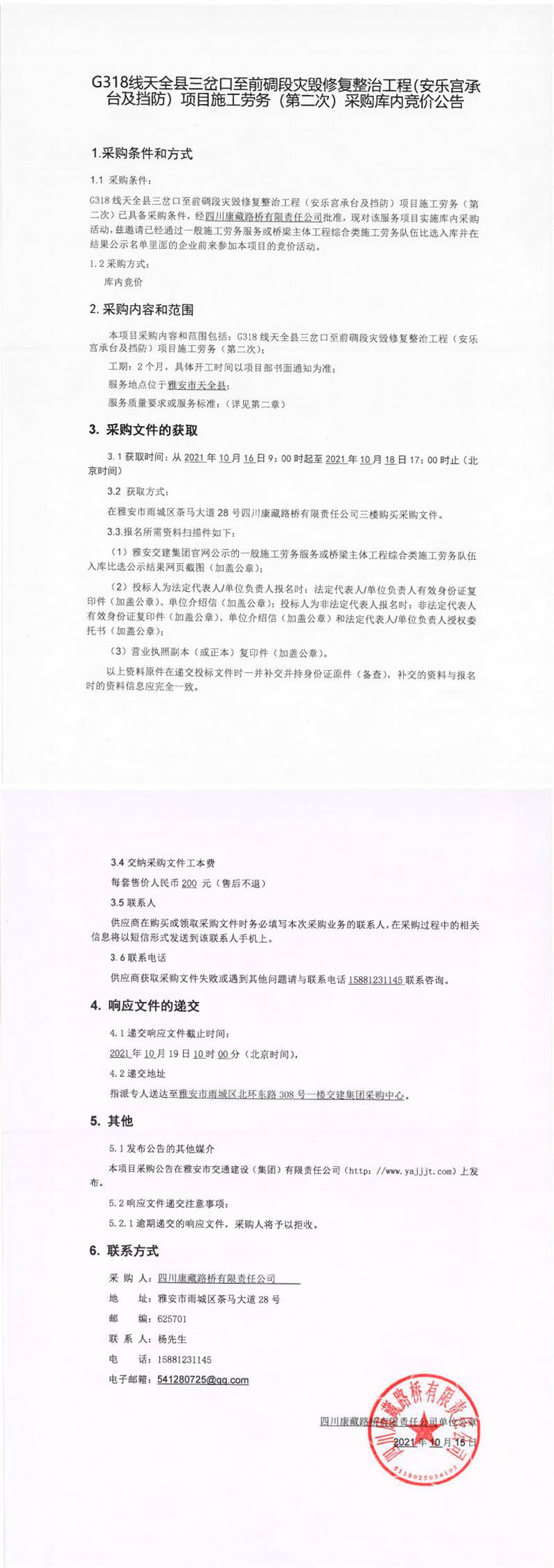 四川康藏路橋有限責任公司G318線天全縣三岔口至前碉段災毀修復整治工程(安樂宮承臺及擋防)項目施工勞務(第二次)采購庫內(nèi)競價公告