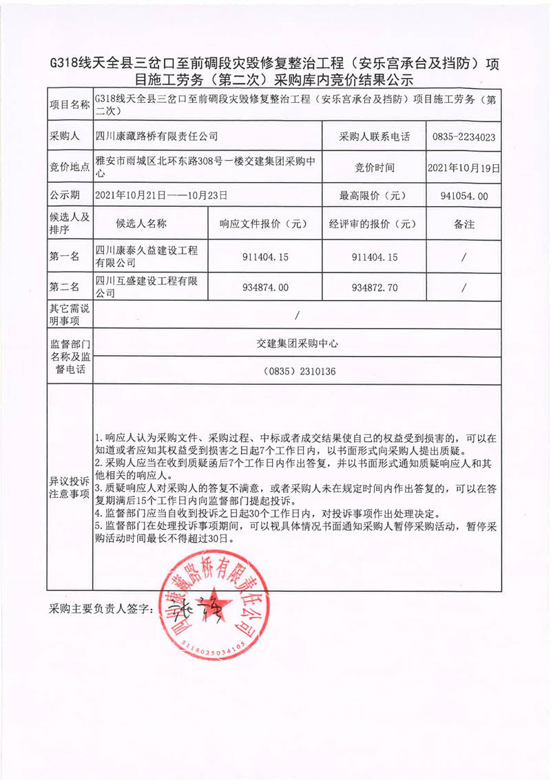四川康藏路橋有限責(zé)任公司G318線天全縣三岔口至前碉段災(zāi)毀修復(fù)整治工程(安樂宮承臺(tái)及擋防)項(xiàng)目施工勞務(wù)(第二次)采購庫內(nèi)競價(jià)結(jié)果公示