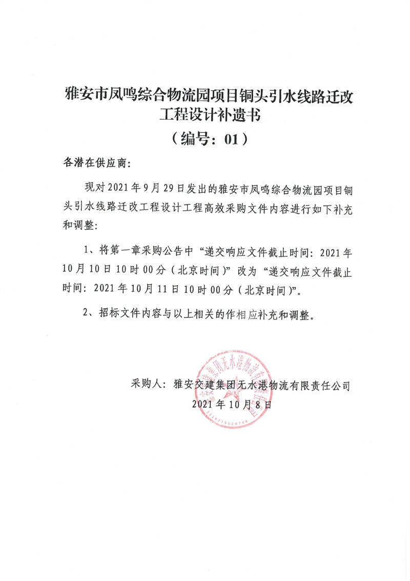 雅安交建集團(tuán)無水港物流有限責(zé)任公司雅安市鳳鳴綜合物流園項目銅頭引水線路遷改工程設(shè)計補(bǔ)遺書