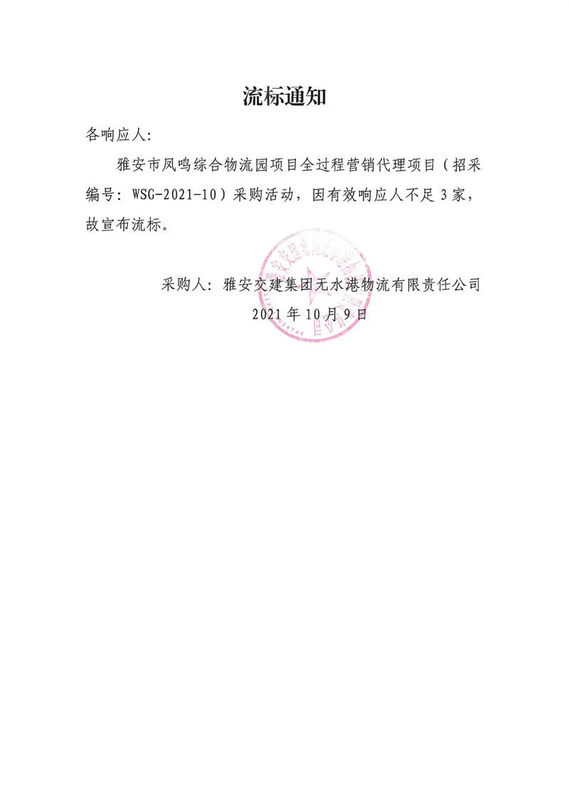 雅安交建集團無水港物流有限責任公司雅安市鳳鳴綜合物流園項目全過程營銷代理項目流標通知