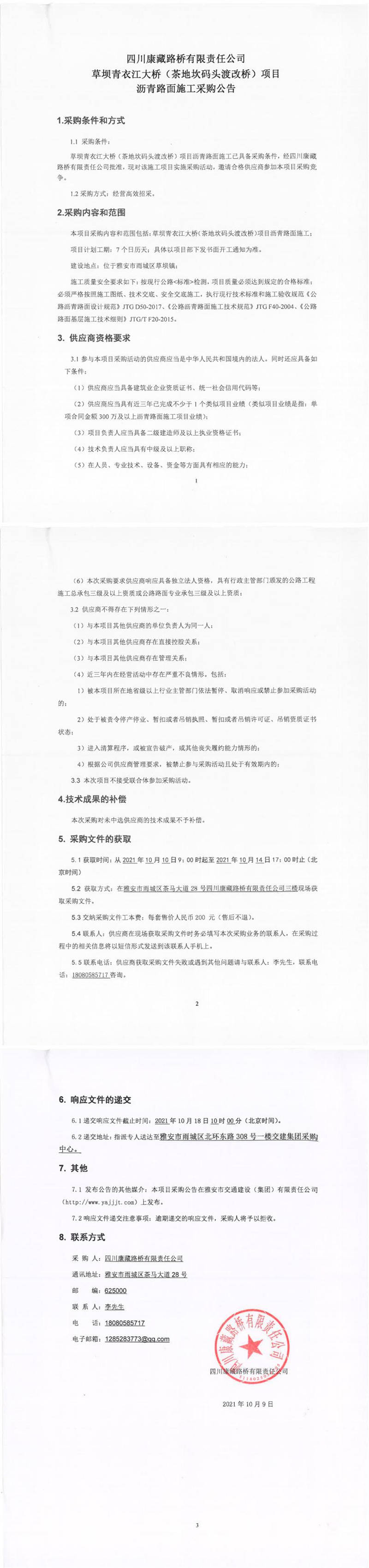 四川康藏路橋有限責(zé)任公司草壩青衣江大橋(茶地坎碼頭渡改橋)項(xiàng)目瀝青路面施工采購公告