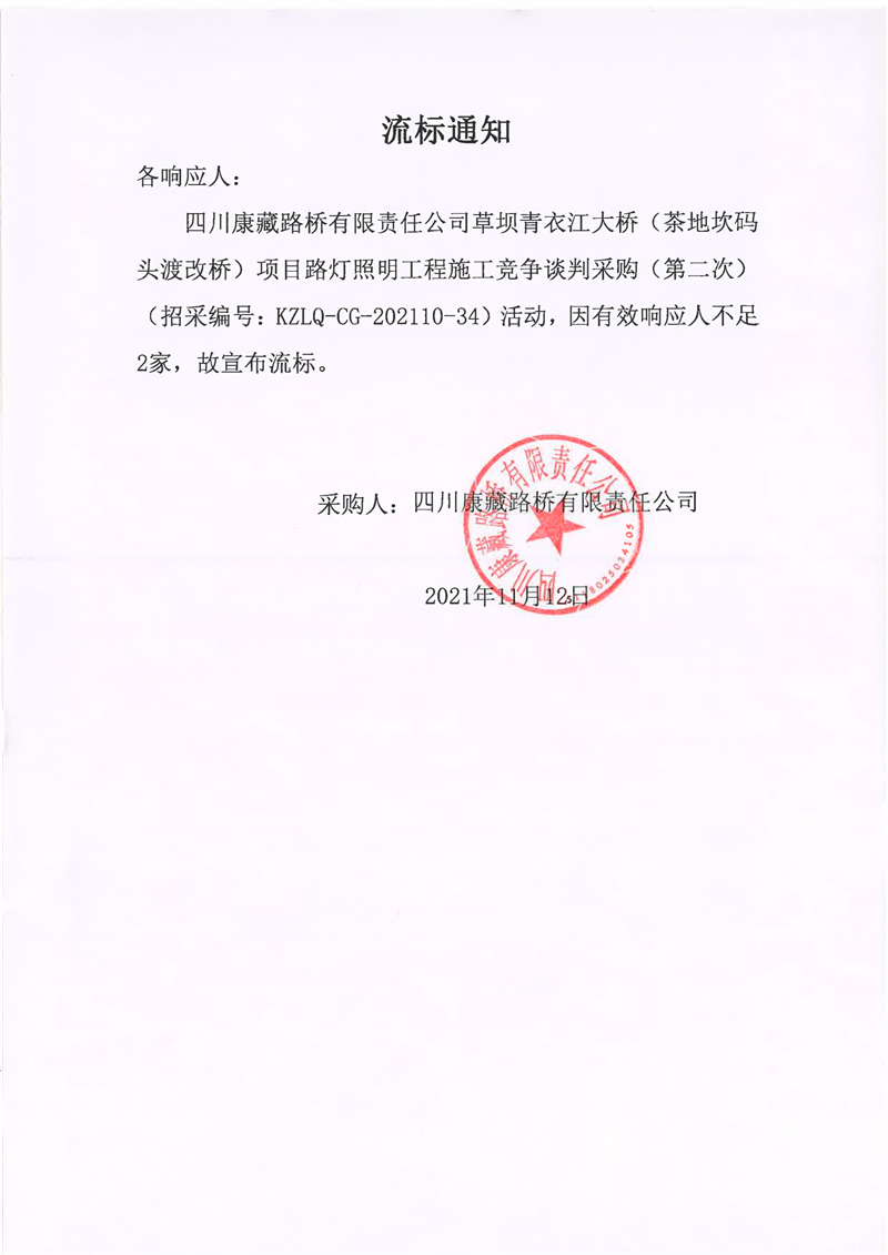 四川康藏路橋有限責(zé)任公司草壩青衣江大橋(茶地坎碼頭渡改橋)項(xiàng)目路燈照明工程施工競(jìng)爭(zhēng)談判采購(第二次)流標(biāo)通知