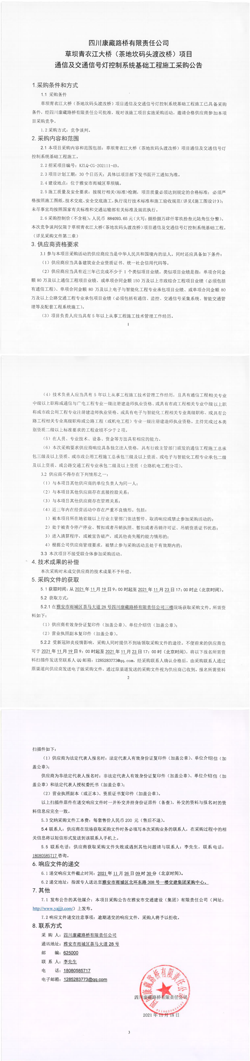 四川康藏路橋有限責(zé)任公司草壩青衣江大橋(茶地坎碼頭渡改橋)項(xiàng)目通信及交通信號(hào)燈控制系統(tǒng)基礎(chǔ)工程施工采購公告