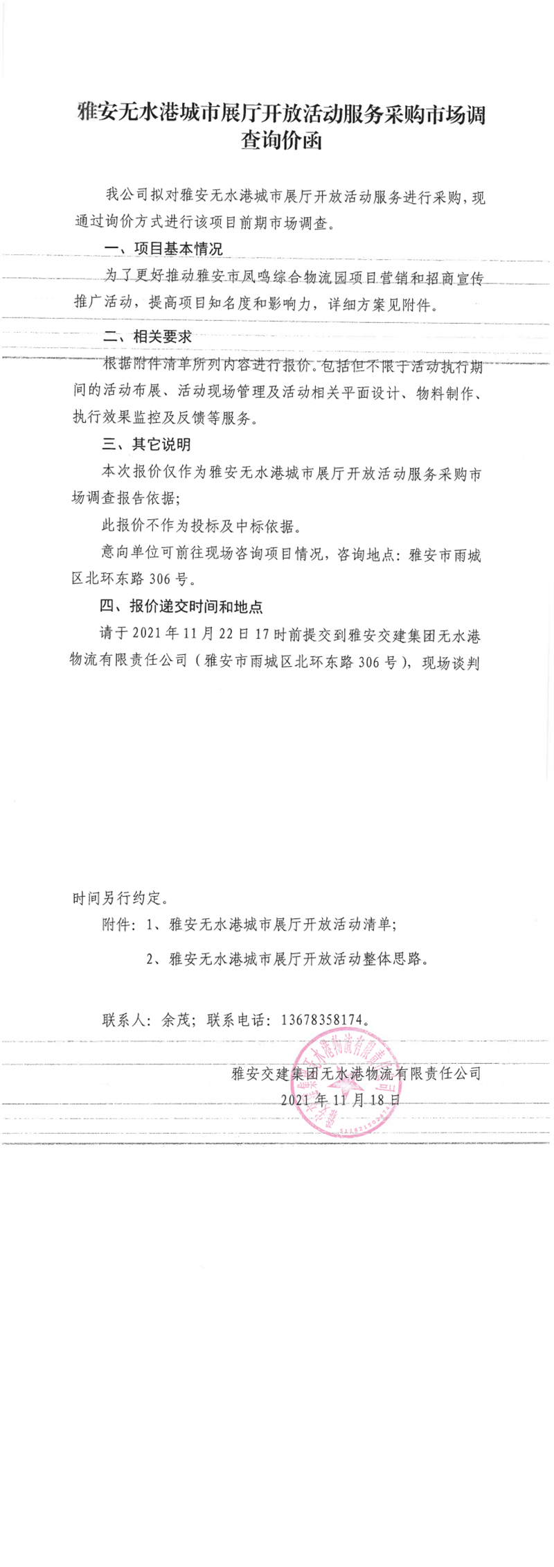 雅安交建集團(tuán)無水港物流有限責(zé)任公司雅安無水港城市展廳開放活動服務(wù)采購市場調(diào)查詢價函