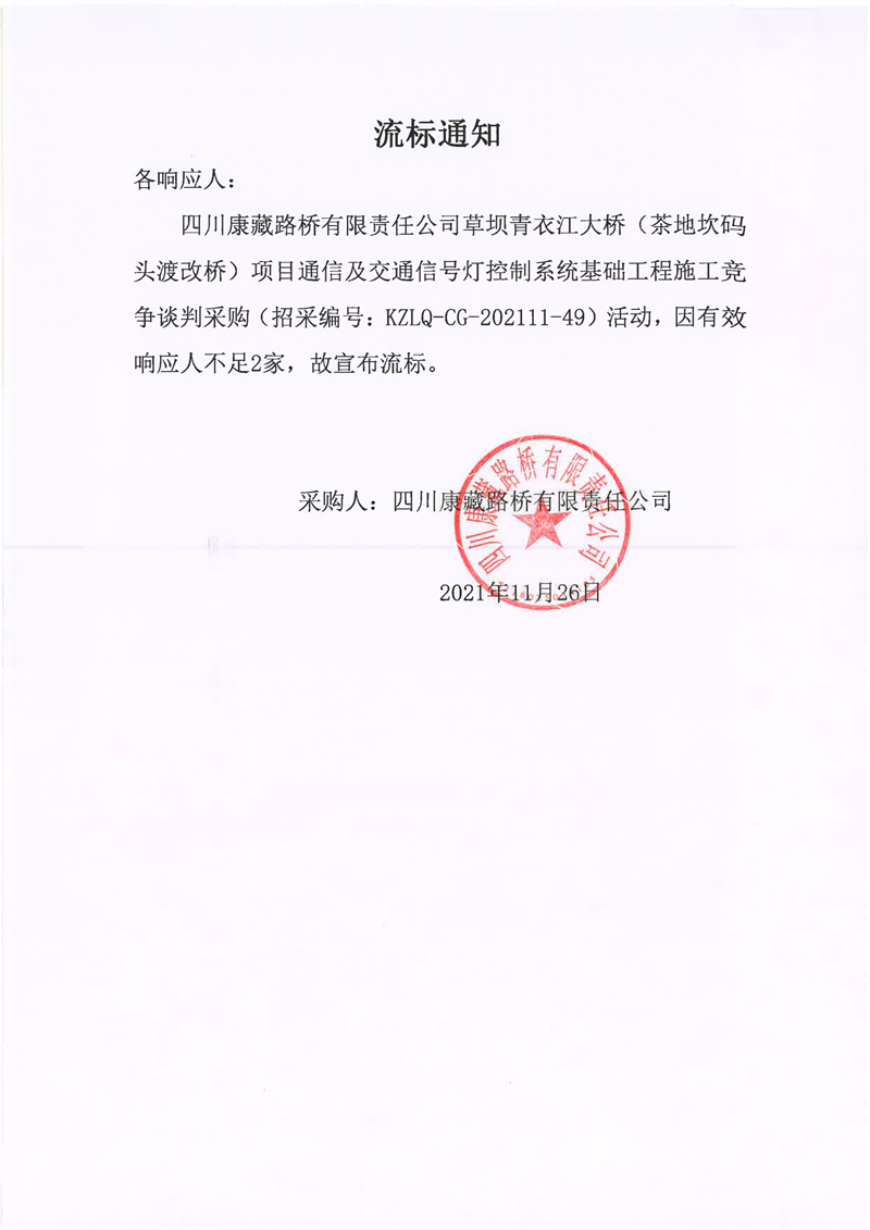 四川康藏路橋有限責任公司草壩青衣江大橋(茶地坎碼頭渡改橋)項目通信及交通信號燈控制系統(tǒng)基礎(chǔ)工程施工采購流標通知