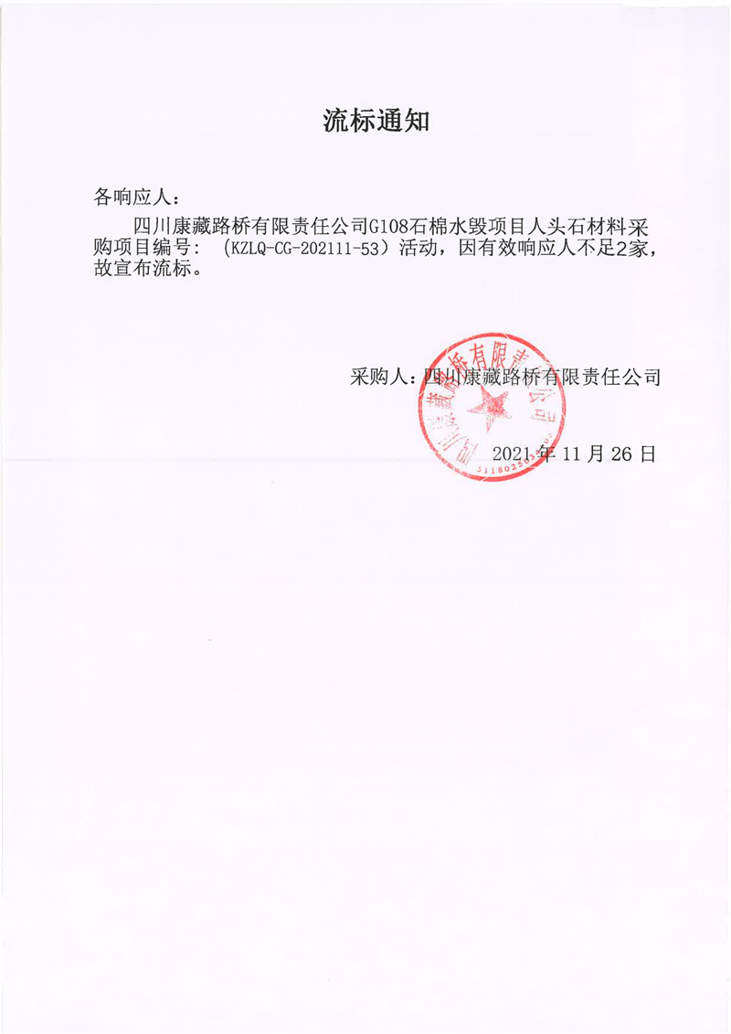 四川康藏路橋有限責(zé)任公司G108石棉水毀項目人頭石材料采購流標(biāo)通知