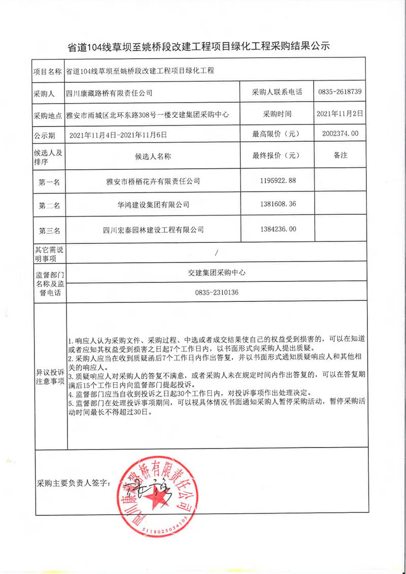 四川康藏路橋有限責任公司省道104線草壩至姚橋段改建工程項目綠化工程采購結果公示