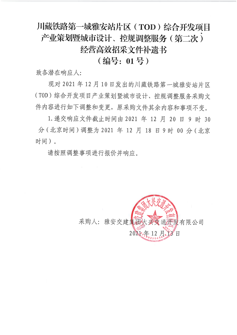 雅安交建集團(tuán)大興交通開發(fā)有限公司川藏鐵路第一城雅安站片區(qū)(TOD)綜合開發(fā)項(xiàng)目產(chǎn)業(yè)策劃暨城市設(shè)計(jì)、控規(guī)調(diào)整服務(wù)(第二次)經(jīng)營高效招采文件補(bǔ)遺書(編號:01號)