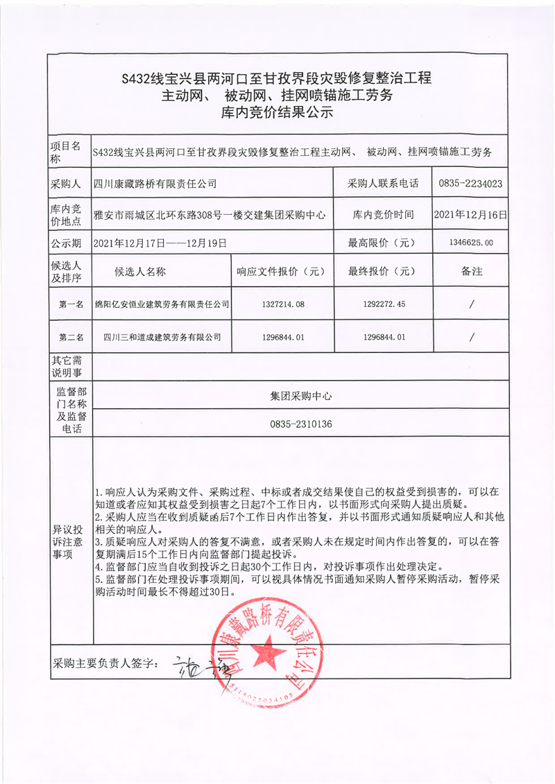 四川康藏路橋有限責任公司S432線寶興縣兩河口至甘孜界段災毀修復整治工程主動網(wǎng)、補動網(wǎng)、掛網(wǎng)噴錨施工勞務庫內(nèi)競價結果公示