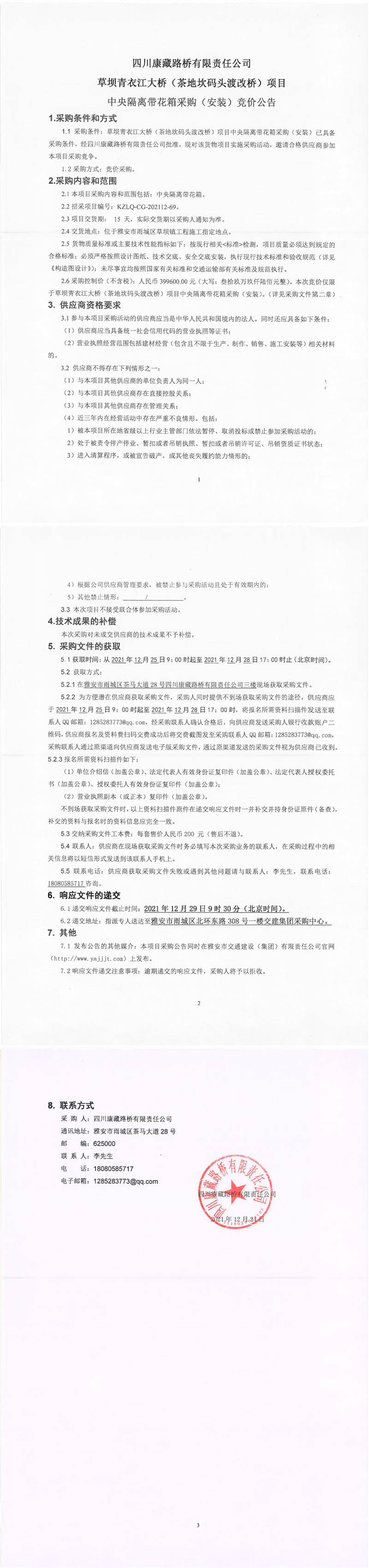 四川康藏路橋有限責(zé)任公司草壩青衣江大橋(茶地坎碼頭渡改橋)項目中央隔離帶花箱采購(安裝)競價公告